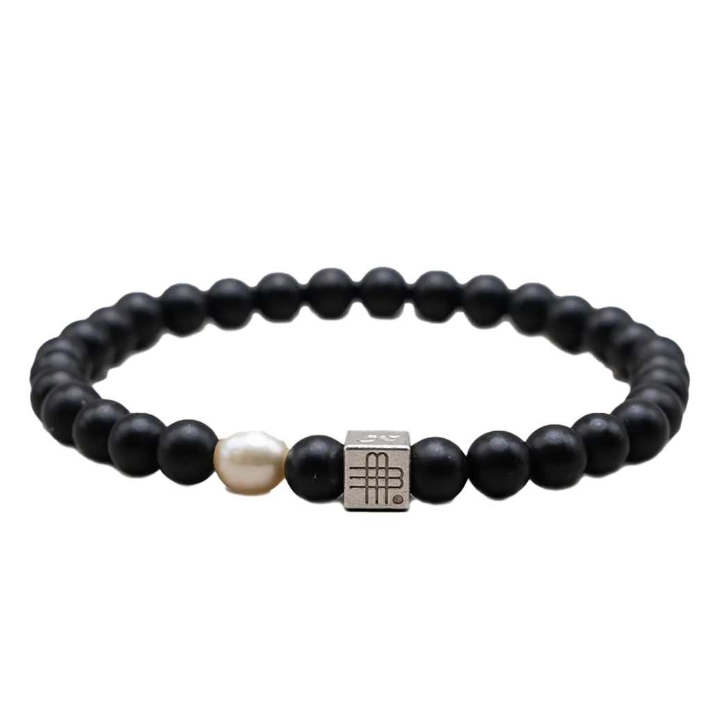 The PEARL bracelet combines deep black onyx stones with a unique natural pearl, whose organic structure makes each piece one of a kind. No two pearls are alike — their individual shape and texture give the bracelet a distinctive touch. A precisely crafted cube made of 925 sterling silver with a fine engraved logo adds a striking accent. A stylish accessory with an unmistakable character.