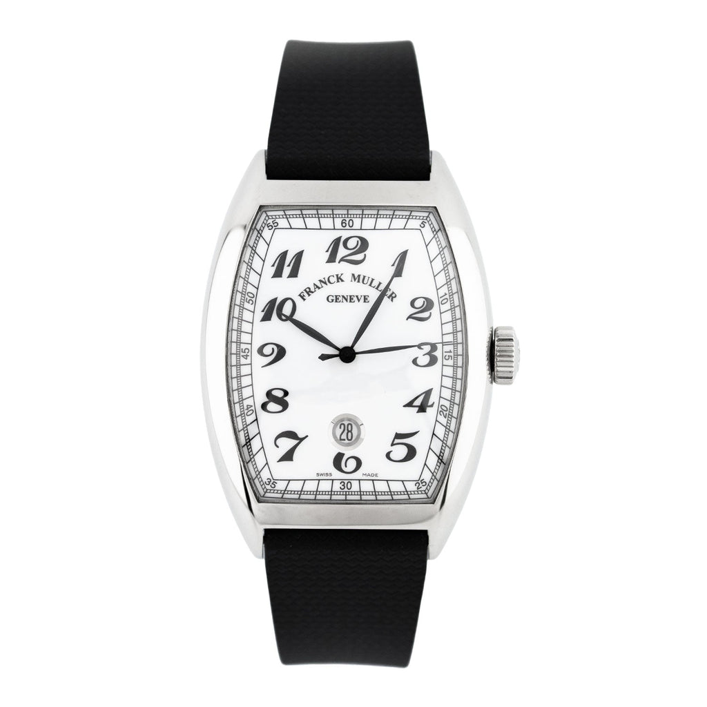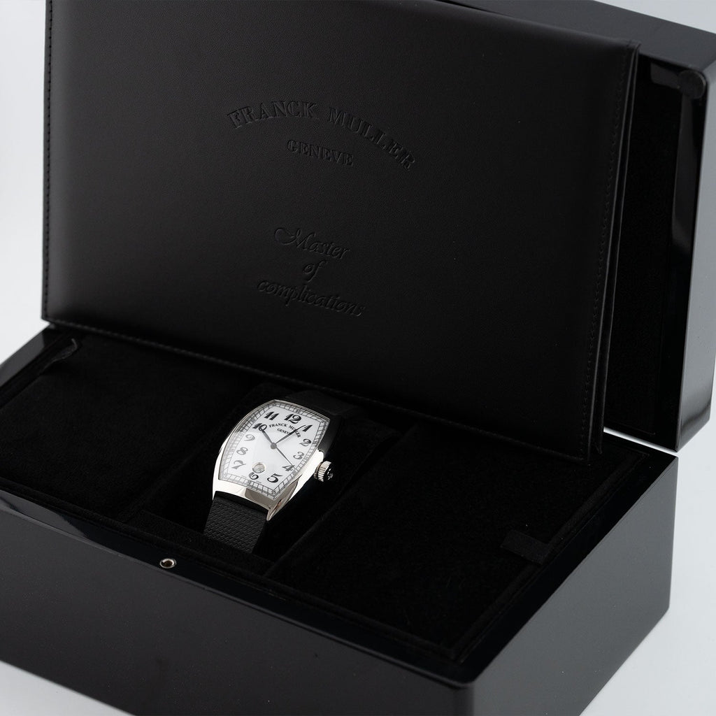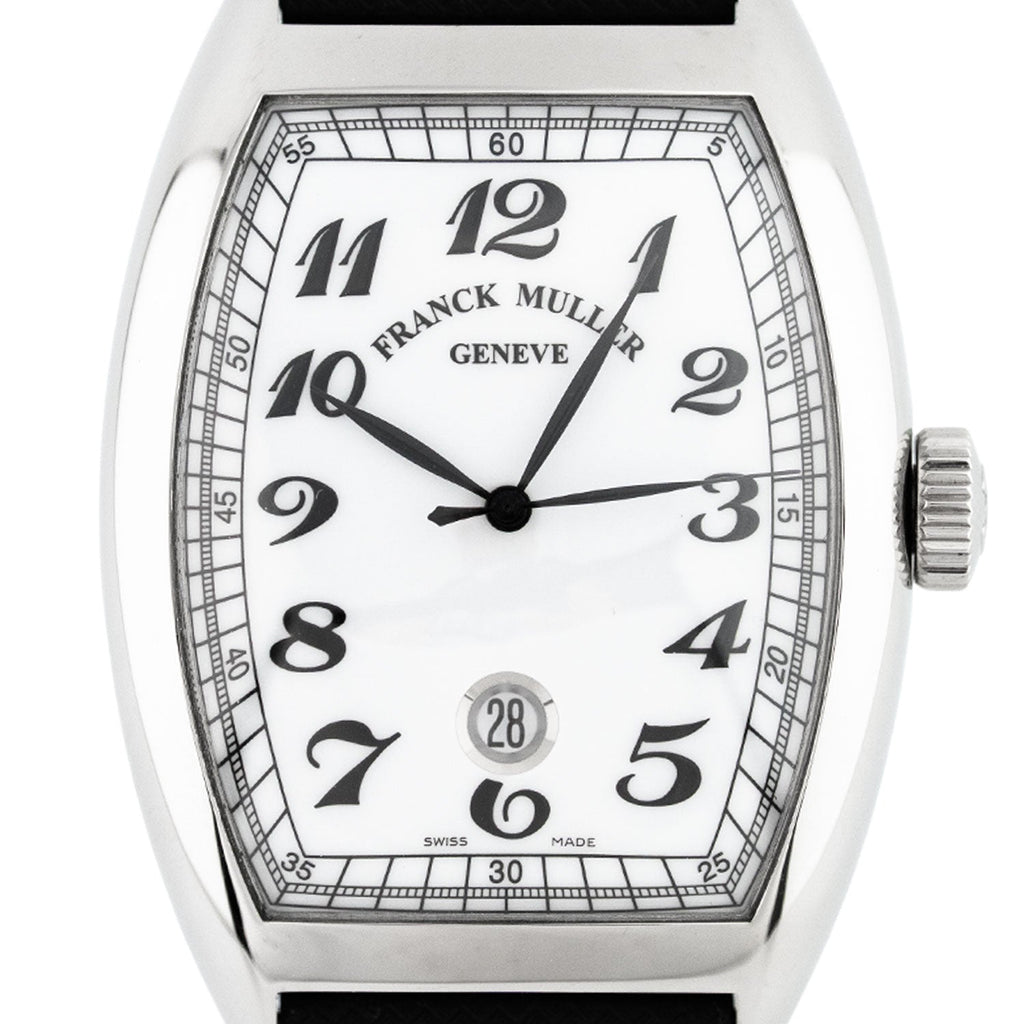 The Franck Muller Cintrée Curvex, reference 8880SCDT VIN, from 2010, embodies classic elegance in its purest form. The striking stainless steel case features the iconic tonneau-shaped Cintrée Curvex design, perfectly highlighting the watch's harmoniously curved lines. The finely guillochéd silver-colored dial with its signature curved black Arabic numerals and the discreet date display at six o'clock creates an elegant yet distinctive appearance.
