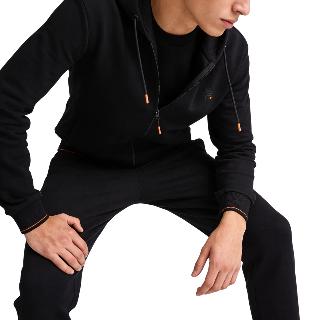 The “Legacy” zip hoodie impresses with its high-quality workmanship and straight cut made of pure cotton. The hood with drawstring and the side pockets ensure functionality, while the ribbed cuffs with orange decorative stripes on the sleeves and hem as well as the ribbon cuffs add subtle accents. Versatile - perfect for sporting and leisure occasions.