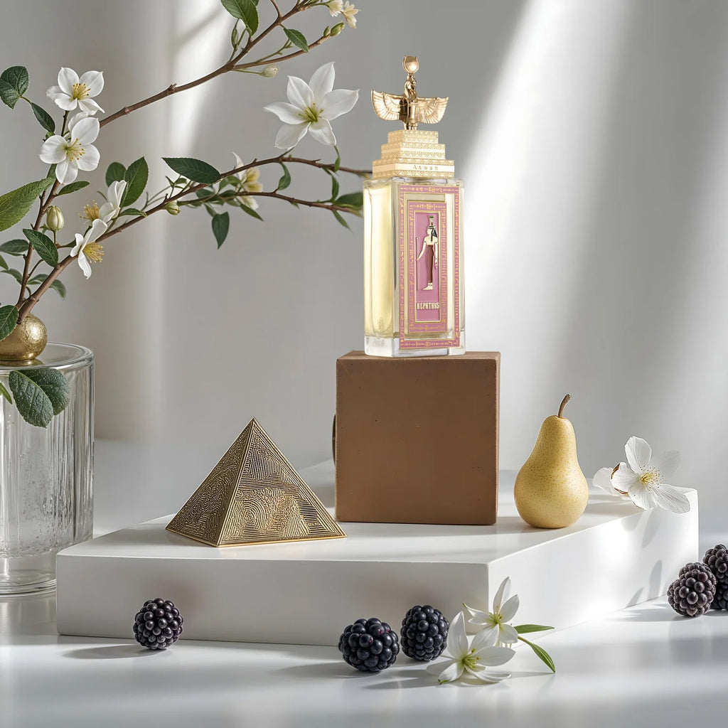 In the stillness before dawn, a veil of powdery softness unfolds — delicate as ancient linen kissed by morning light. Pomelo adds a sparkling citrus shimmer, while Magnolia blossoms in creamy radiance, opening the gate between the earthly and the divine. This is where Nephthys awakens — guardian of the veil, whisperer between life and rebirth.