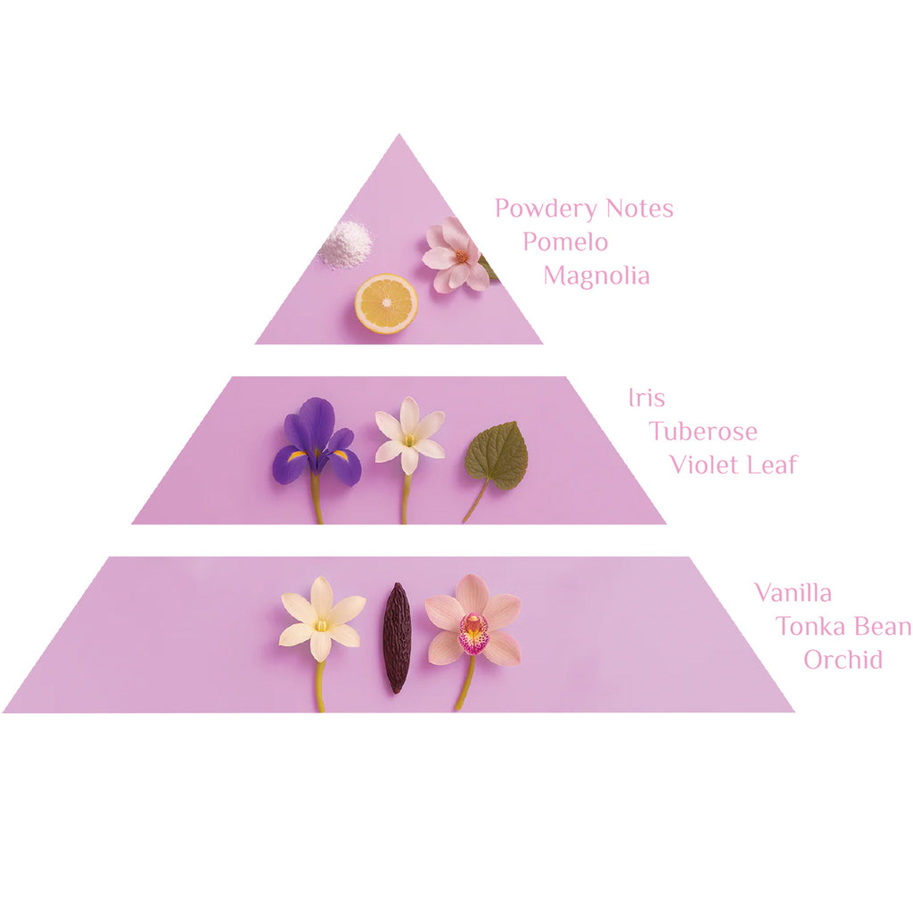At her heart blooms a sacred trinity of grace and mystery. The noble elegance of Iris intertwines with the intoxicating bloom of Tuberose, while Violet Leaf breathes green vitality — symbolizing renewal, compassion, and eternal guardianship. Together they form a spiritual harmony, guiding the soul through transformation with gentle strength.