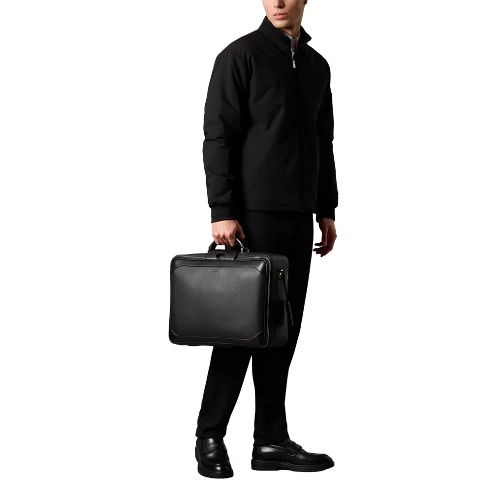 Inspired by the distinctive silhouette of classic pilot bags. Entirely crafted from grained leather and refined with smooth leather accents. The spacious main compartment opens fully and closes securely with a sturdy zipper and an additional snap button. A discreet zip pocket on the back provides quick access to essentials. A detachable leather shoulder strap and a durable handle offer versatile carrying options. A matching leather address tag and finely crafted premium metal hardware complete the meticulously handcrafted design.