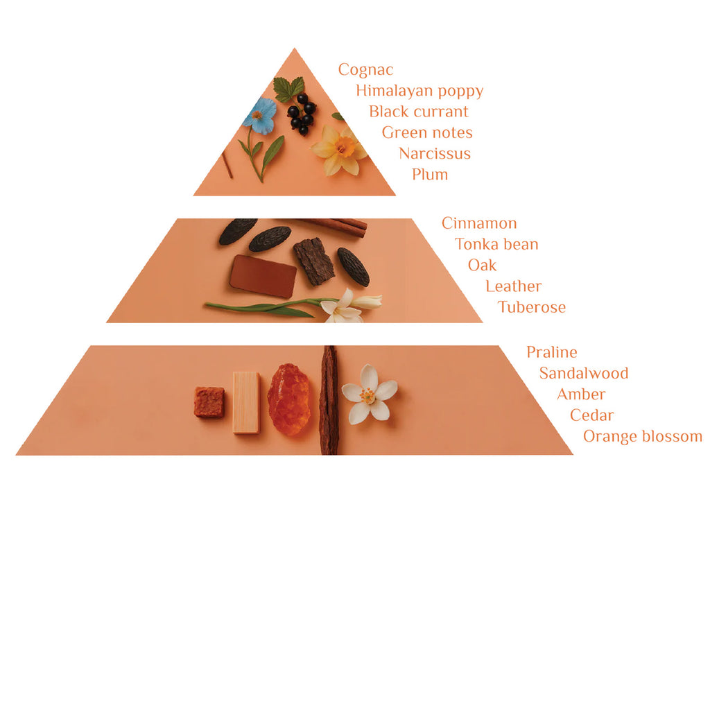 The base is a golden embrace of Praline, Sandalwood, and Amber, grounded in Cedar’s sacred wood. Orange Blossom drifts gently through the air, symbolizing renewal and fertility. Together, they leave a trail that is both sweet and regal — the scent of divine balance, love, and strength.