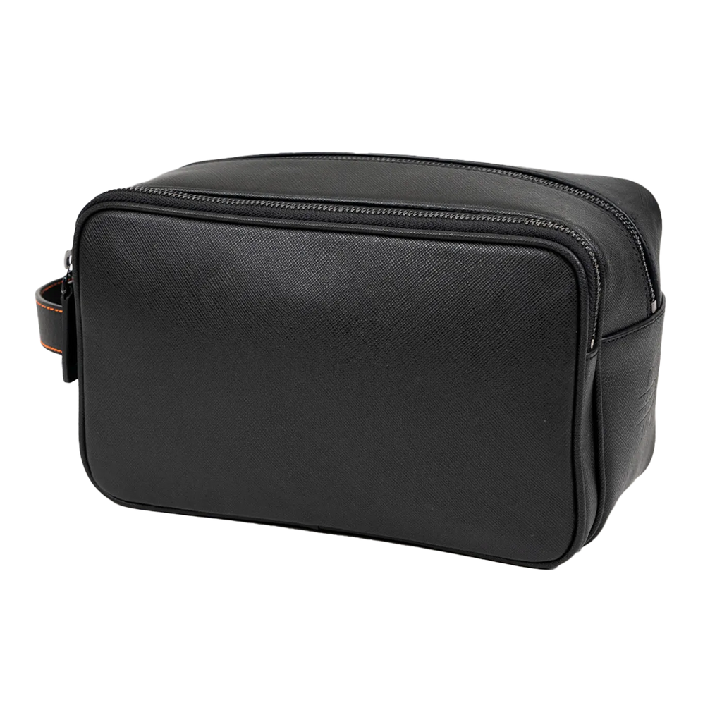 This handcrafted wash bag impresses with its precise craftsmanship and functional design. Made from distinctively textured Saffiano leather, it features two separately closable main compartments that keep your essentials neatly organized. An additional flat zip pocket in the front compartment ensures secure storage for smaller items, while an integrated mesh pocket in the rear compartment enhances the clear interior structure.